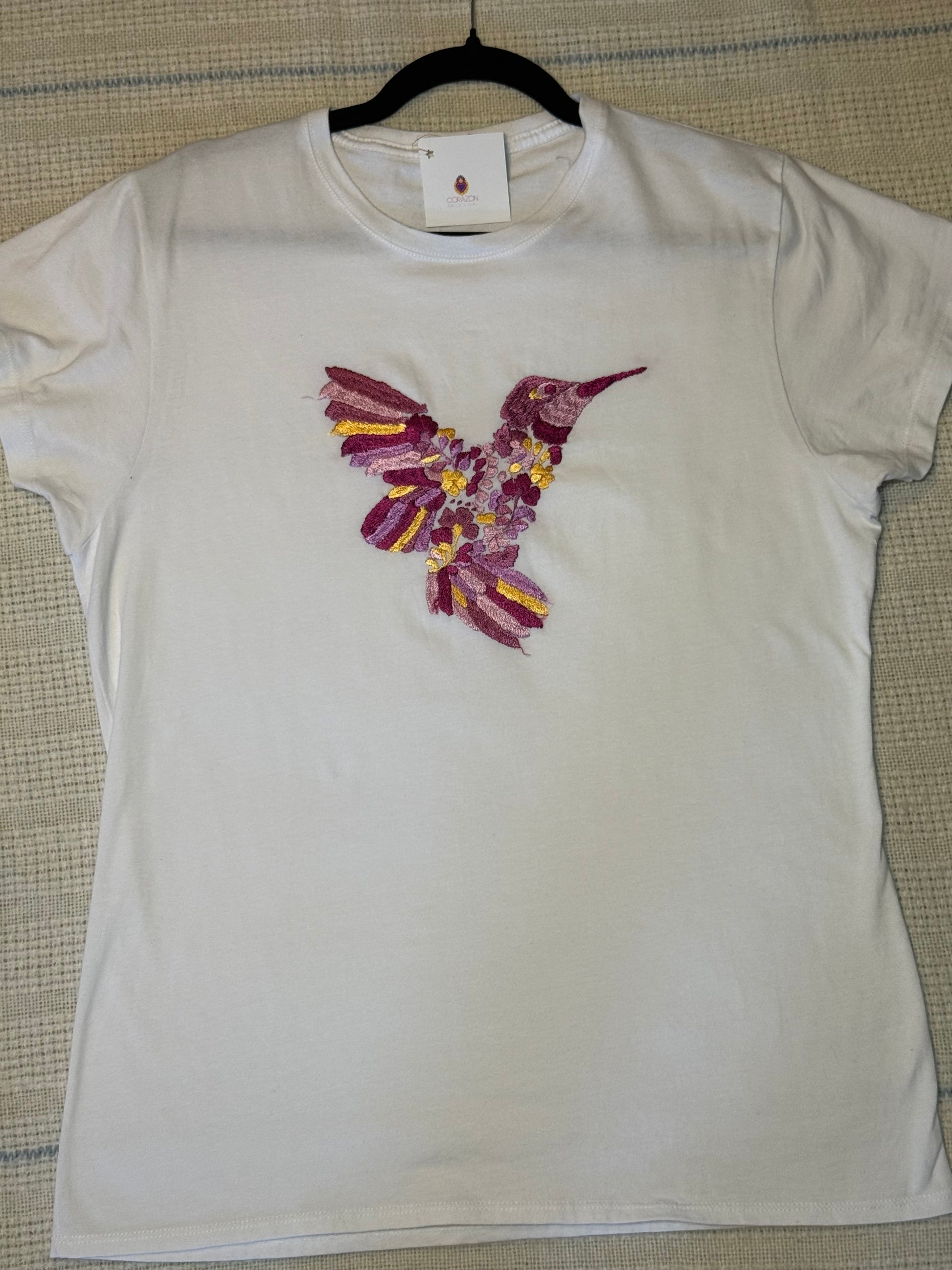 100% cotton t-shirts that do not shrink, hand-embroidered with Christmas designs. The embroidery is authentic, made by artisans from Oaxaca Mexico.